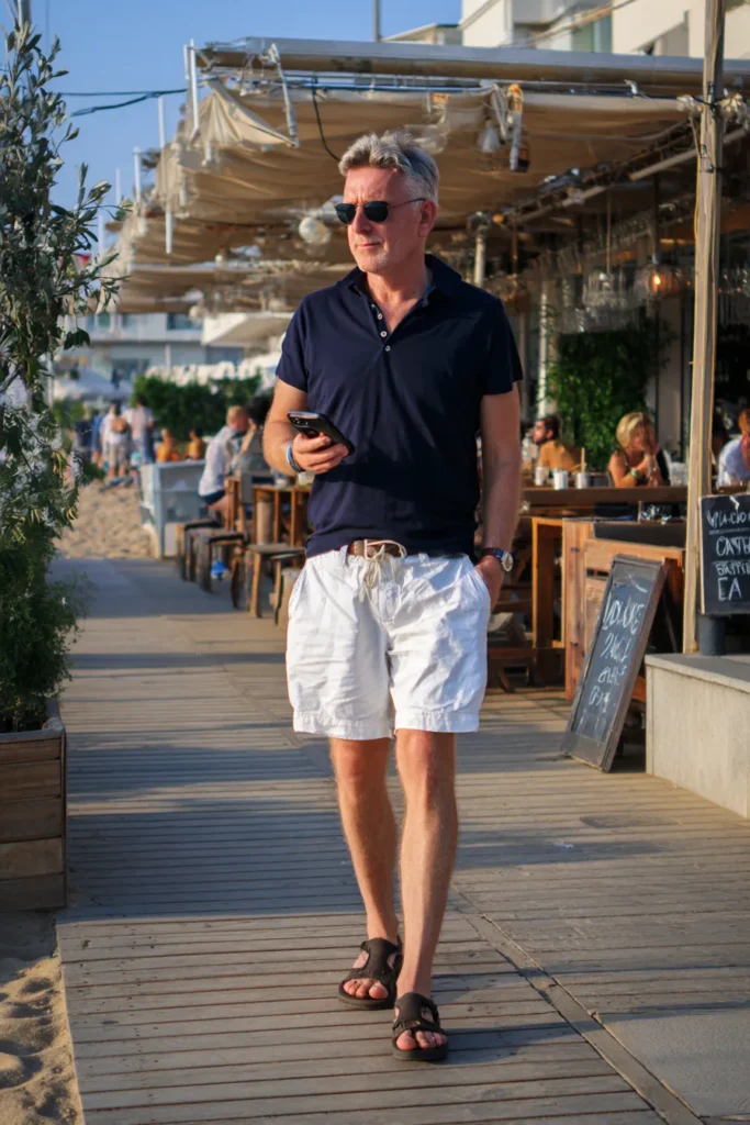 This outfit is the definition of nautical neatness and absolute classic vacation style. He is wearing a crisp, short-sleeved polo shirt in a deep, dark navy blue, which is a fantastic contrast against the rest of the look. The shirt is paired with bright white, relaxed-fit cotton shorts, cinched with a light brown woven belt for a touch of texture. Dark leather sandals, a wristwatch, and stylish sunglasses complete this effortless, yet very put-together, holiday outfit.