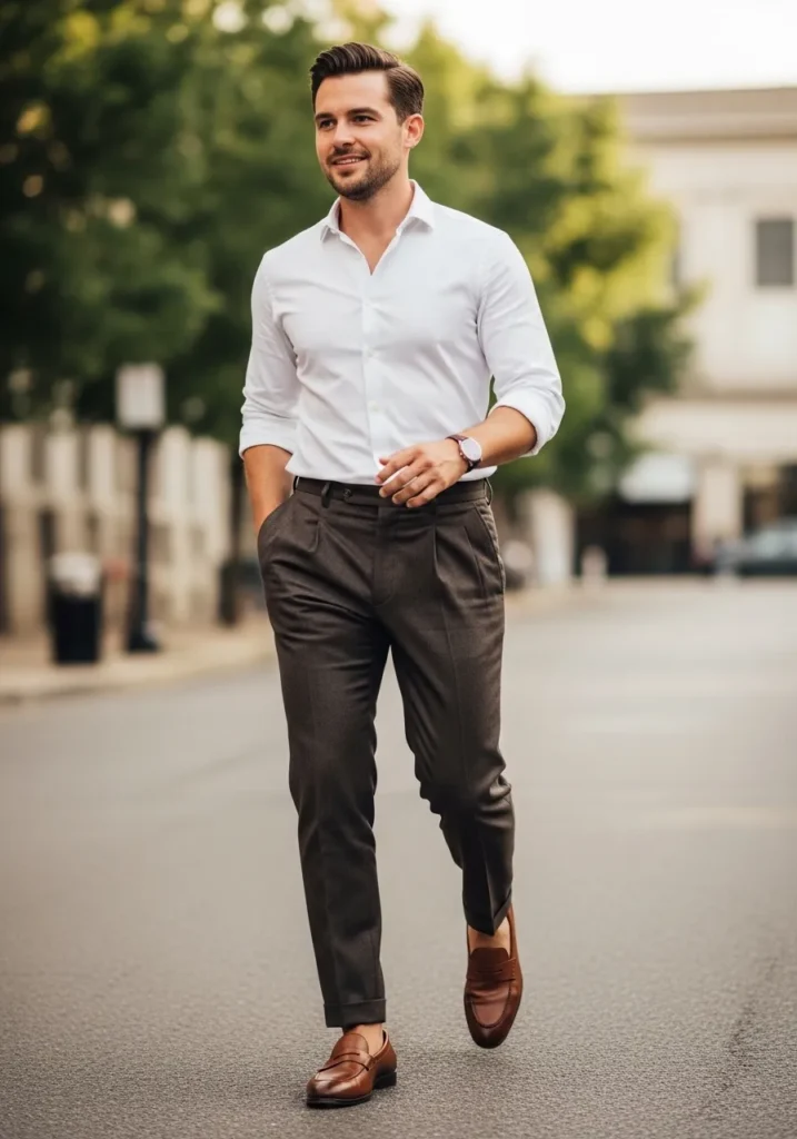 This look keeps things clean and confident with a fitted white button down shirt tucked into tailored dark brown trousers. The pants have a sleek slim fit with a slight crop at the ankle, showing off rich brown leather loafers. The shirt sleeves are casually rolled up, and a simple watch adds that subtle finishing touch. The overall vibe feels polished but relaxed, like he is heading to a meeting and dinner right after.