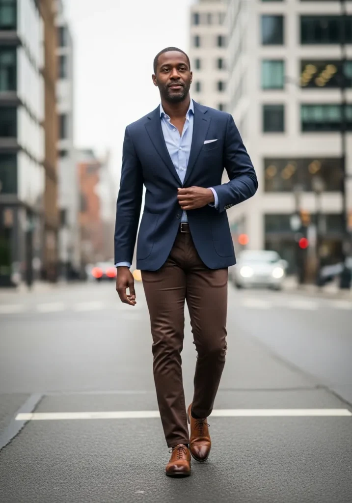 This outfit pairs slim fit brown trousers with a tailored navy blazer for a clean and confident city look. Underneath, he wears a light blue button down shirt that keeps things fresh and polished. The trousers are sharply tailored and sit perfectly at the ankle, styled with rich brown leather lace up shoes that match the warm tone of the pants. The whole look feels structured, modern, and very put together without trying too hard.