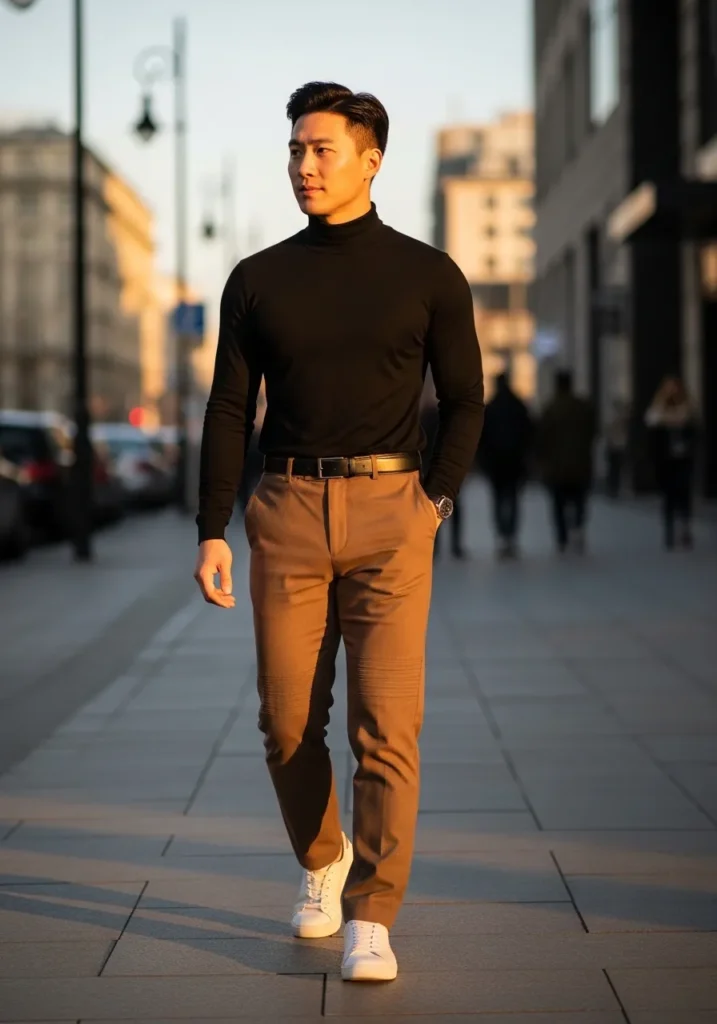 This look is sleek and modern with a fitted black turtleneck tucked into warm brown slim fit trousers. The pants are tailored close to the leg and styled with a simple belt that keeps everything sharp and clean. Crisp white sneakers add a fresh contrast that keeps the outfit from feeling too formal. The overall vibe feels confident, minimal, and city ready, especially in that golden hour light.