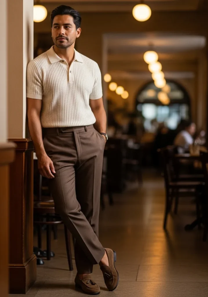This outfit feels refined and relaxed at the same time. He is wearing tailored brown dress pants with a clean straight leg fit, paired with a cream ribbed knit polo that adds subtle texture. The soft knit fabric gives the top a polished yet comfortable look, while brown suede loafers keep the color palette warm and cohesive. Everything fits close to the body without looking tight, creating a smooth and confident silhouette.