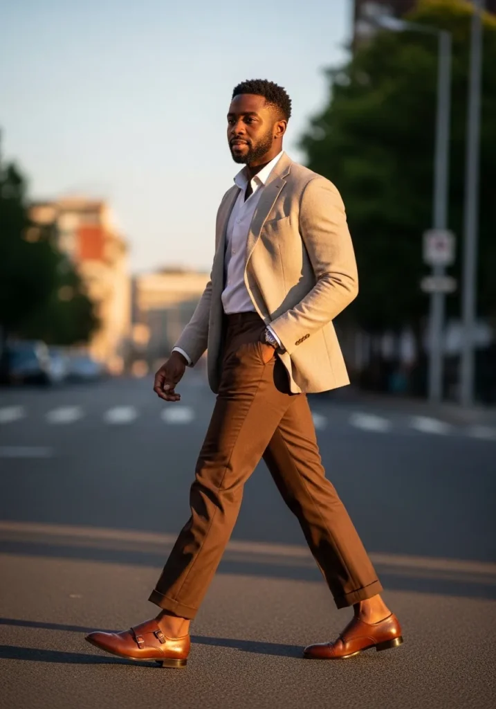 This look feels fresh and elevated with tailored brown trousers styled in a slightly cropped length. The pants sit neatly at the ankle and are paired with sleek brown leather monk strap shoes that add a refined touch. On top, he wears a crisp white button down shirt layered under a light beige blazer. The soft neutral blazer brightens the deep brown trousers and gives the whole outfit a smooth, polished finish.