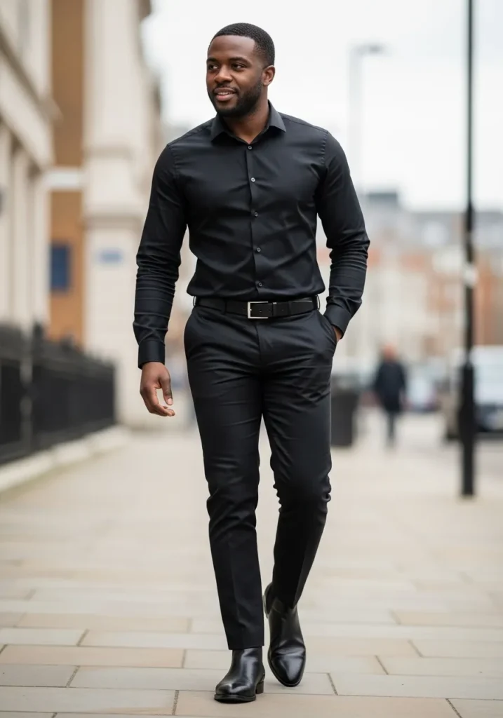 This look features a fitted black button down shirt paired with slim black trousers and polished black leather shoes, creating a sharp and clean silhouette that feels modern and intentional from head to toe.