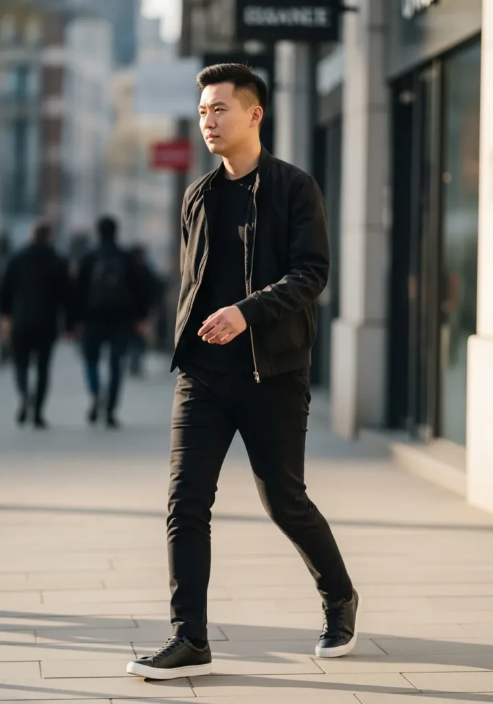 This look features a black lightweight jacket layered over a black top with slim black pants and clean black shoes, creating a modern and versatile outfit.