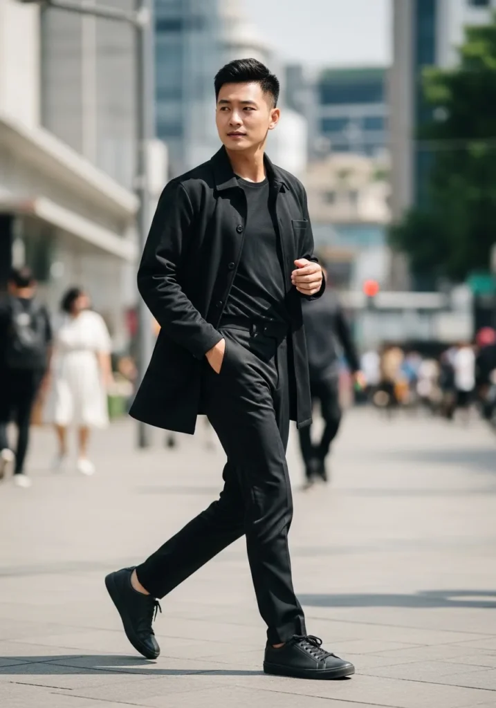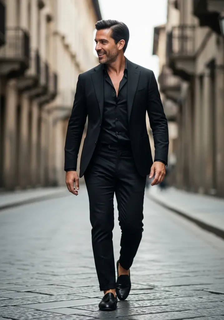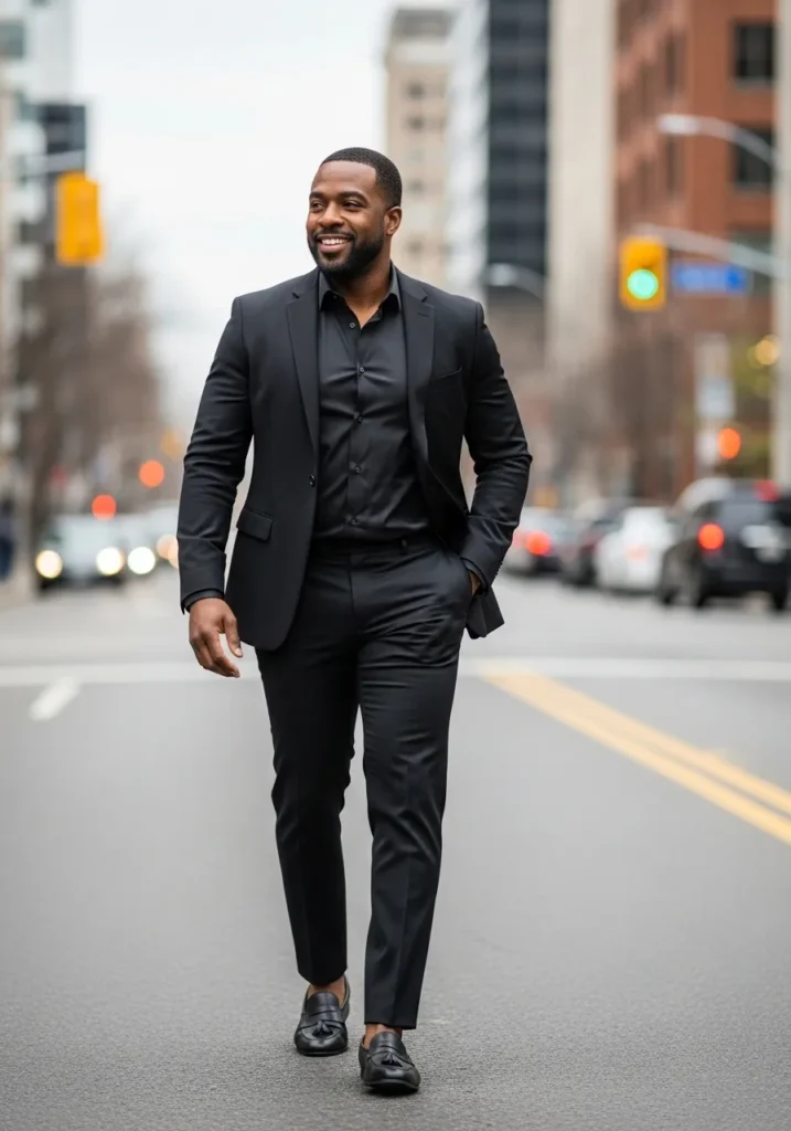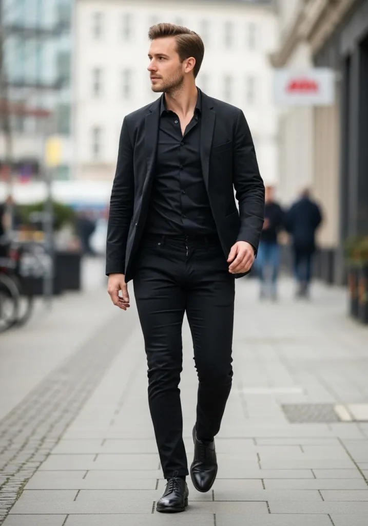 This outfit leans into tailored black suiting with a fitted jacket, matching black trousers, and sharp black shoes, creating a silhouette that feels structured, modern, and ready for city life.