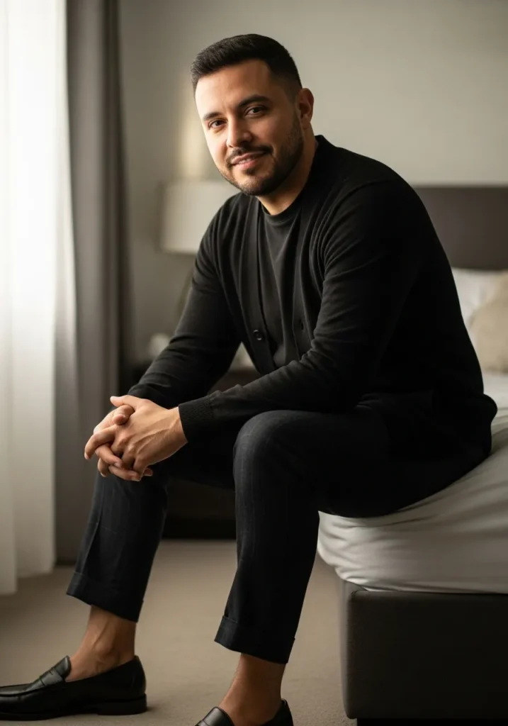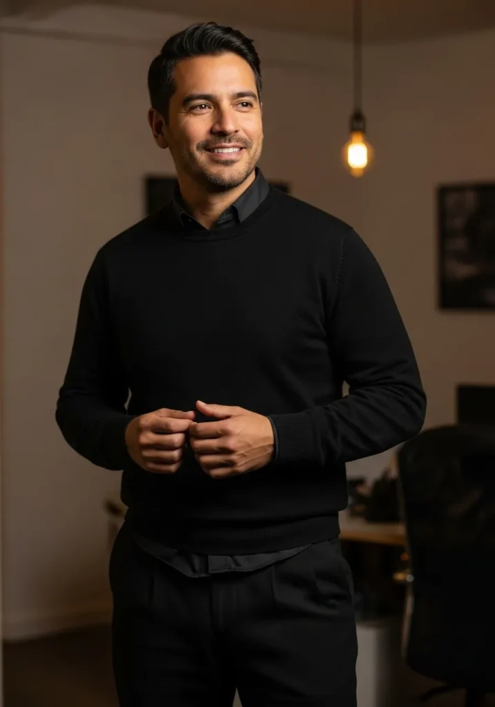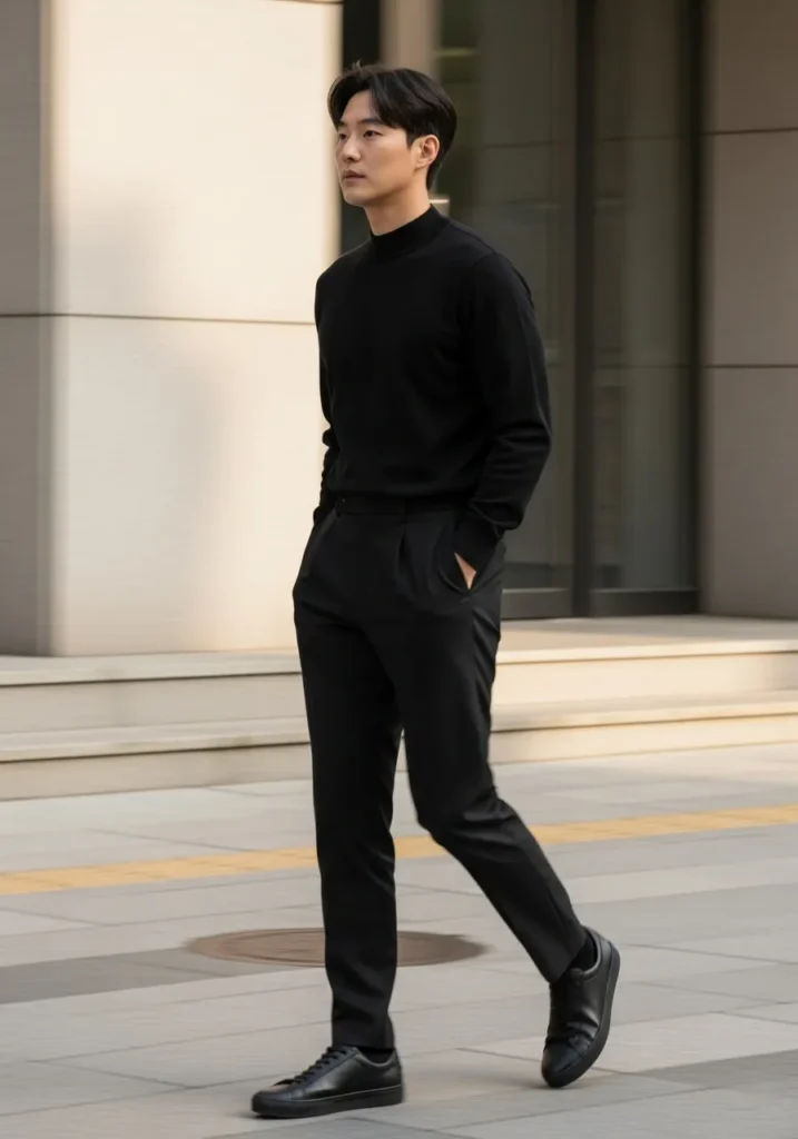 Here we see a fitted black sweater paired with tailored black pants and clean black shoes, giving the outfit a timeless silhouette with smooth lines and a confident presence.
