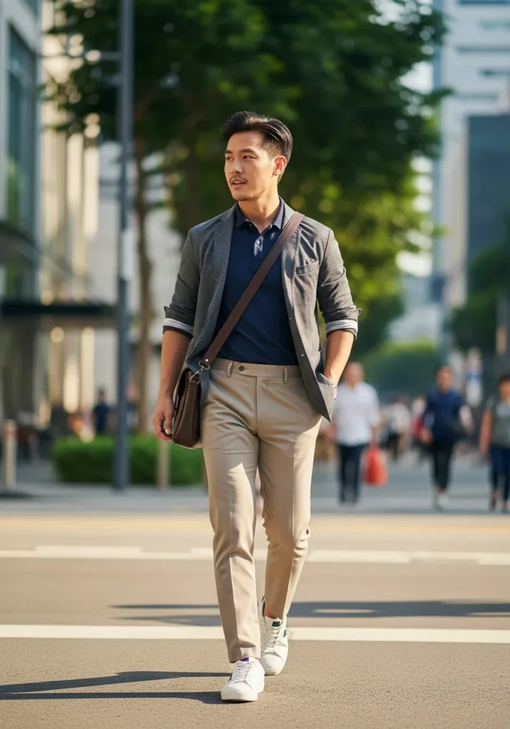 This outfit mixes a casual grey jacket with a soft blue shirt and beige trousers. White sneakers keep the look modern and relaxed while still feeling neat. The overall vibe is clean urban and very current.