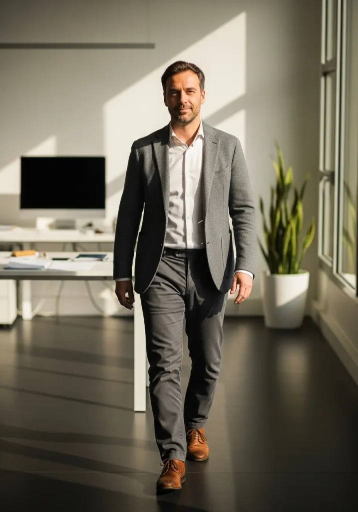 A light grey blazer is styled with a white shirt and deep navy trousers for a timeless business casual look. The brown leather shoes and belt tie everything together and add a classic touch. The fit is clean and balanced with a relaxed yet confident feel.