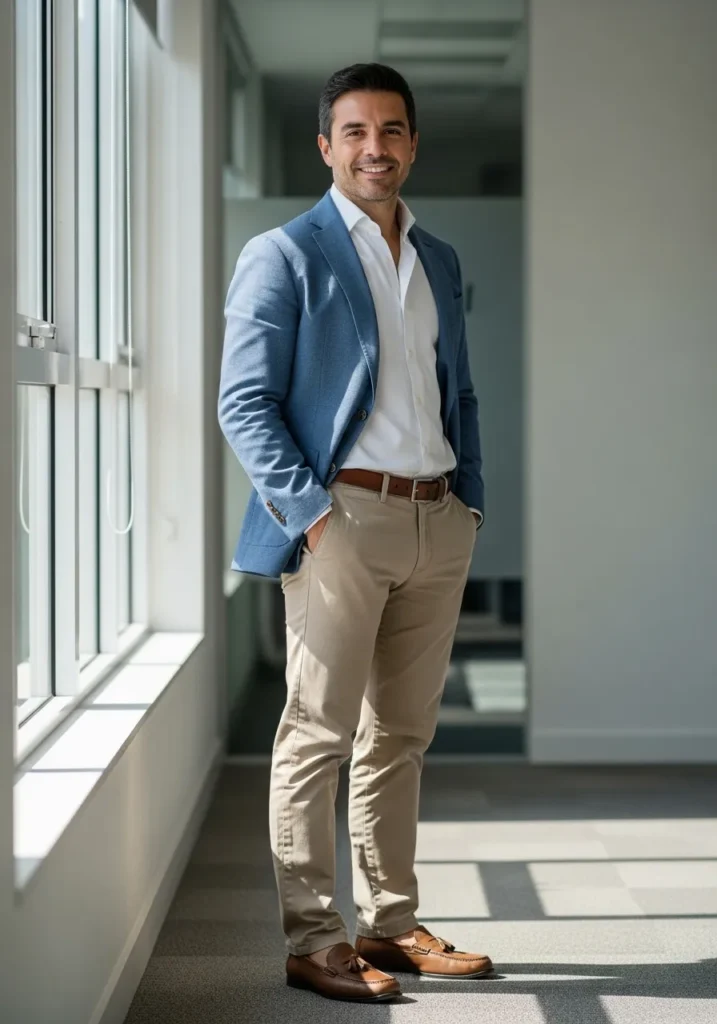 This outfit combines a light blue blazer with a white shirt and beige trousers. The colors feel soft and airy which works beautifully in bright office spaces. Brown leather shoes add just enough structure to keep the look professional.