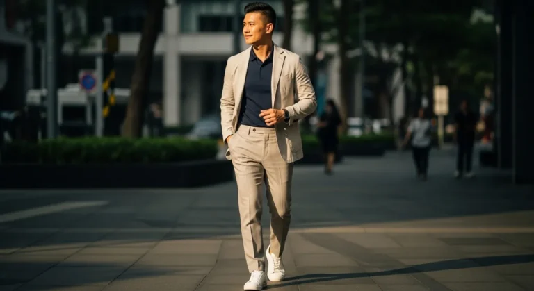 A beige blazer is styled with a light blue open collar shirt and tailored navy trousers. The color combination feels timeless and clean. Brown dress shoes add a polished finish without making the outfit feel stiff.