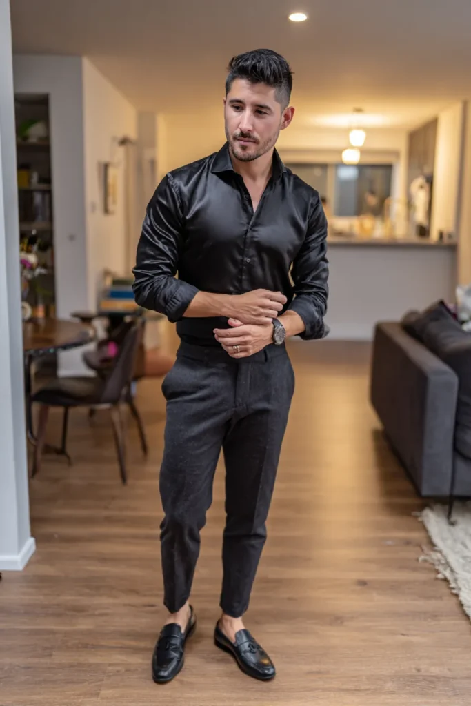 This outfit is all about texture and subtle luxury a fantastic choice for an indoor party or dinner gathering. The top half is a fitted black dress shirt made from a silky or satin-like fabric that catches the light beautifully, giving it that super luxe party feel. This is perfectly balanced with tailored charcoal or dark grey trousers that look like they have a nice subtle wool texture. He finished the look with black leather loafers and a simple watch, keeping the whole vibe sophisticated and put-together without needing a blazer.
