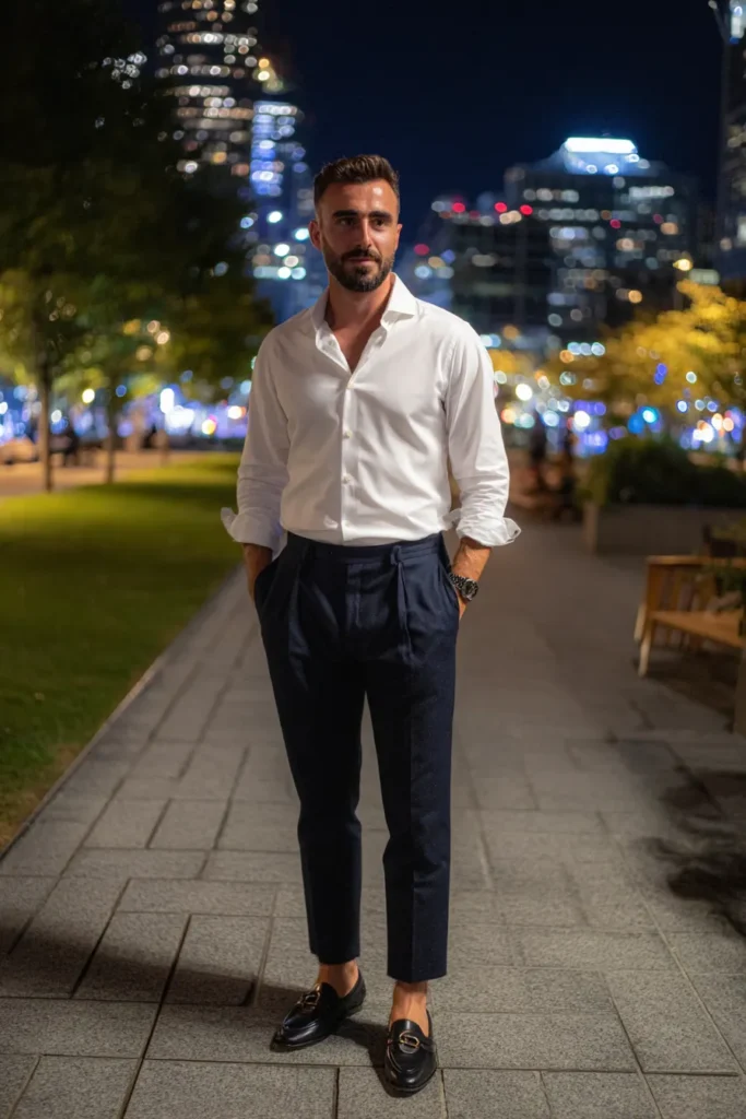 This is the definition of understated sophistication perfectly suited for a warm-weather city party or evening patio event. The foundation is a classic, sharply pressed white dress shirt, neatly tucked in with the sleeves rolled up to achieve that effortlessly cool vibe. He paired this with dark, tailored navy blue pleated trousers that have a subtle texture and a slightly cropped length, which is super chic. The whole look is anchored by fabulous black leather loafers with a distinguishing gold detail, adding a touch of bold personality.
