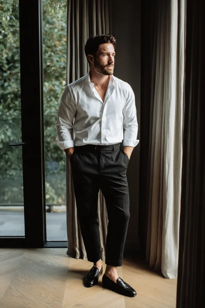 This outfit proves that you don’t need a lot of color to make a strong impact it’s pure, elegant simplicity perfect for a semi-formal party or swanky house event. The top is a very crisp, white button-down shirt worn with the collar open and sleeves perfectly rolled, adding a relaxed flair to the traditional piece. He paired this with tailored, dark charcoal or black trousers that are sharply creased and neatly cuffed at the ankle. The final touch is a pair of super sleek black leather loafers worn without socks, giving it a cool, slightly European summer vibe.