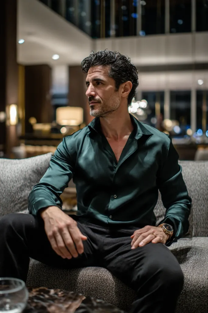 Oh my goodness, this look is absolute luxury and sophistication perfect for a swanky hotel bar or an exclusive penthouse party. The star is that breathtaking deep emerald green satin shirt, which has a beautiful sheen and instantly feels festive and high-end. He paired this richly colored top with tailored black trousers, which provides a grounding contrast and keeps the focus on the shirt’s stunning color and texture. A sleek gold watch adds the final touch of polished glamour to this undeniably suave ensemble.