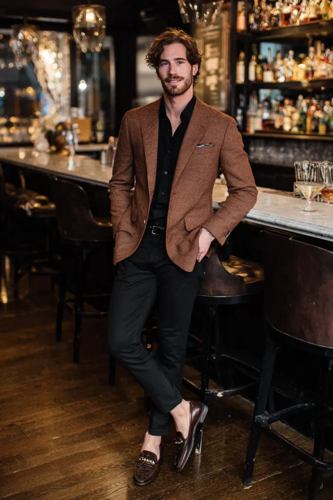 I just love how sophisticated this color combination is, especially for the cooler months the warm earth tones of the blazer really pop against the solid black base. Wearing the shirt unbuttoned without a tie is such a fantastic way to make a tailored jacket feel relaxed and party-ready. And seriously, those loafers are everything they add a brilliant layer of texture and a confident, modern flair that elevates this whole ensemble beyond the average suit jacket.