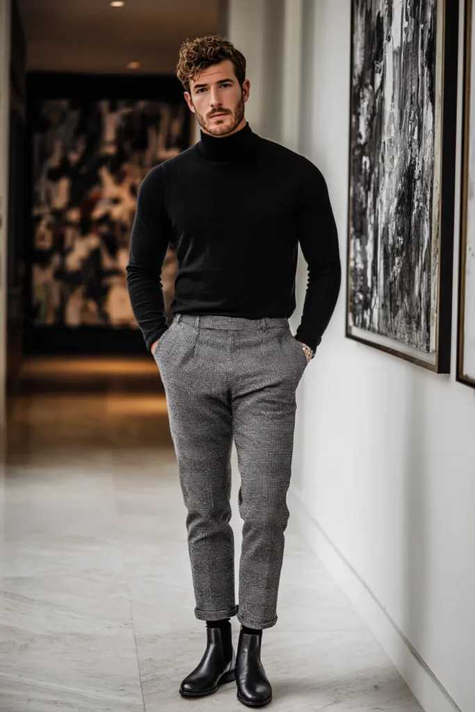 This look is the ultimate blend of cozy comfort and high-fashion edge perfect for a winter party or gallery opening. He’s wearing a fitted black turtleneck sweater, likely fine gauge wool, which provides a clean, elegant silhouette. The star of the show, though, are those amazing grey plaid or subtle houndstooth trousers, which are tailored, slightly cropped, and cuffed to show off his super sleek black Chelsea boots. The whole outfit is grounded in dark tones but elevated by the texture and pattern.