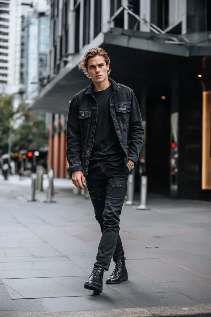 If you’re into a vibe that says effortlessly cool with a little bit of rock and roll edge, this is seriously perfect. I love that he kept the whole outfit black because it instantly makes a simple denim-on-denim look feel so much sleeker and more high-fashion. The dark color is super flattering, and mixing the different denim textures adds that subtle visual interest that makes you want to look closer. Plus, those chunky boots just completely anchor the look and make it feel ready for anything the night throws his way.
