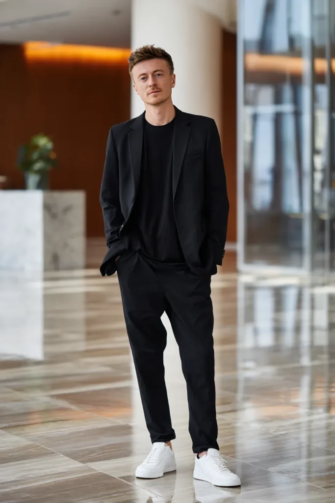 This look is the definition of high-low styling it takes a classic suit and flips it into a fresh, cool party outfit perfect for a sophisticated yet trendy event. He’s wearing a fitted black suit, featuring a sharp blazer and coordinating trousers, but instead of a formal shirt, he opts for a simple black crew-neck t-shirt underneath. The surprising element that makes this entire ensemble pop is the footwear a pair of bright white, clean leather low-top sneakers, which instantly makes the suit feel modern and relaxed.