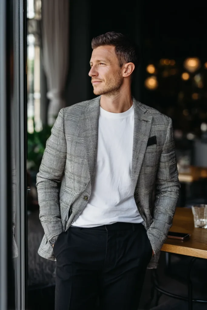 This is a smart casual masterpiece taking traditional tailoring and giving it a relaxed, contemporary twist perfect for a daytime event or early evening gathering. The foundation is a pair of crisp black trousers paired with a simple, well-fitting white crew-neck t-shirt. The real statement piece is the jacket a sophisticated grey and white checked or plaid blazer that provides great texture and pattern contrast against the plain base. He finishes the look with a black pocket square, which is a subtle nod to formality while keeping the overall vibe breezy and effortlessly cool.