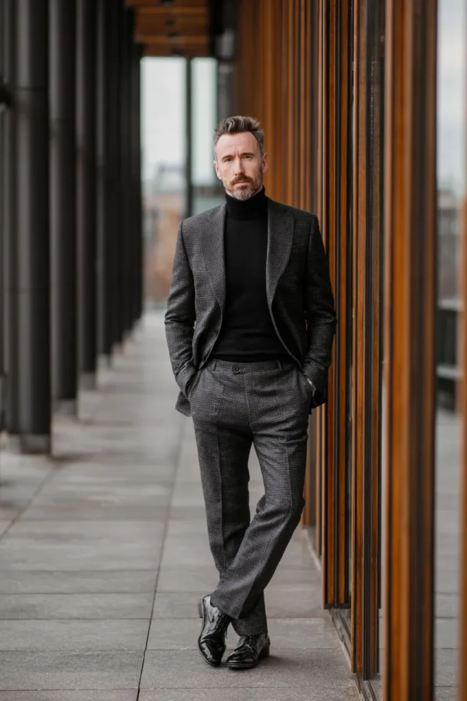 This outfit is all about taking traditional tailoring and giving it a super chic, modern edge perfect for a formal winter party or business cocktail event. He’s wearing a beautifully fitted suit in a dark charcoal grey with a subtle check or plaid pattern, which adds great dimension. Instead of the usual shirt and tie, he opts for a sleek black turtleneck sweater underneath, instantly making the suit feel contemporary and sophisticated. He finishes the look with shiny black lace-up dress shoes, keeping the overall vibe sharp and effortlessly confident.