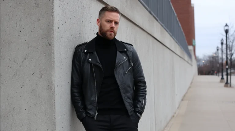 I just love how the turtleneck replaces the need for a shirt and tie because it’s a confident, stylish move that feels so much more modern than a suit. The monochrome effect created by pairing the dark navy top with the black trousers is super chic and definitely lengthens his frame, making the outfit incredibly flattering. Honestly, this look proves that sometimes the most simple, high-quality pieces are the ones that make the biggest impression.