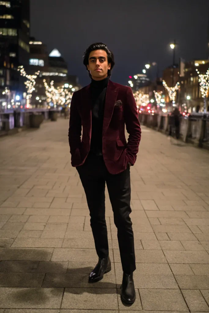 Talk about a statement maker this party look centers around a gorgeous burgundy or deep red velvet blazer, giving off serious luxurious vibes. Underneath, he’s wearing a fitted black turtleneck, which is such a chic alternative to a standard shirt and tie. The rest of the outfit is kept streamlined and dark with sleek black trousers and super polished black Chelsea boots. There’s even a subtly patterned pocket square peeking out, adding that extra touch of sophisticated flair that just screams high-end evening event.