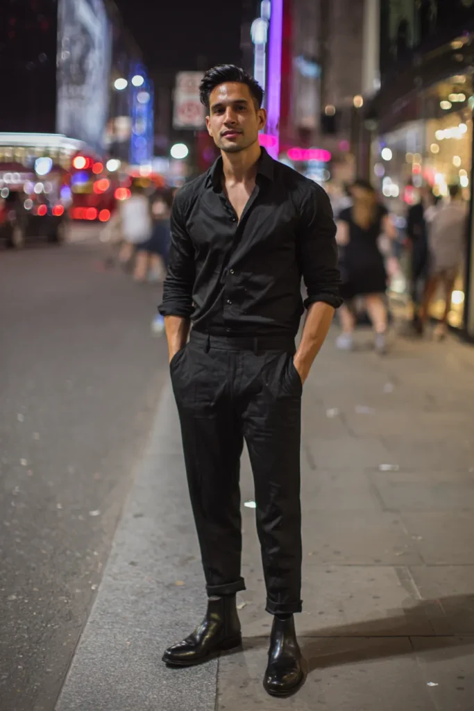 This is the ultimate sleek and confident look for a city night out featuring head-to-toe black which is always a winner. He’s rocking a classic black button-down shirt left partially unbuttoned for a relaxed, slightly edgy feel. The shirt is paired with tailored black trousers that are subtly cuffed at the ankle, really showing off those glossy black leather Chelsea boots. The monochrome color palette keeps everything incredibly sharp and minimal, perfect for a busy street party or a cool, late-night venue.