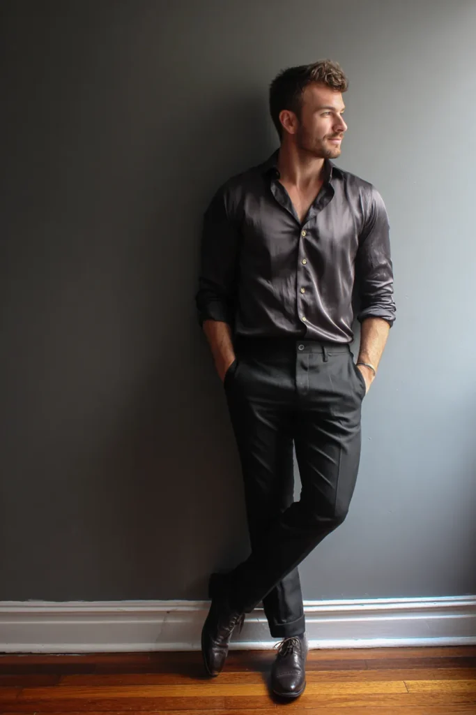 This sophisticated look is perfect for a glamorous cocktail party or a stylish date night, relying entirely on texture and shine. Up top, he is wearing a dark, silky satin button-down shirt in a beautiful deep charcoal or gunmetal grey that looks liquid in the light. This dressy top is paired with sharply tailored, dark black trousers which appear to have a slight sheen themselves, keeping the look cohesive and upscale. He finishes it off with dark leather lace-up shoes, creating a vibe that is sleek, confident, and utterly chic.