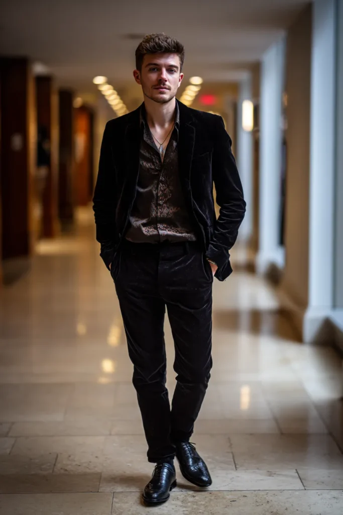 Hello, chic sophistication this all-dark outfit is absolutely divine for a high-end party or holiday event. It features a fitted black velvet blazer and matching black velvet trousers that immediately give off a rich, luxurious feel. The real star of the show is the shirt underneath, which appears to be a silky, patterned button-down in dark shades like charcoal or bronze, adding a wonderful visual interest. He finishes the ensemble with stylish black lace-up dress shoes and a couple of simple necklaces, perfectly complementing the slightly open collar.