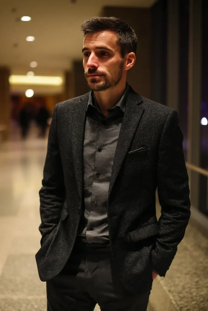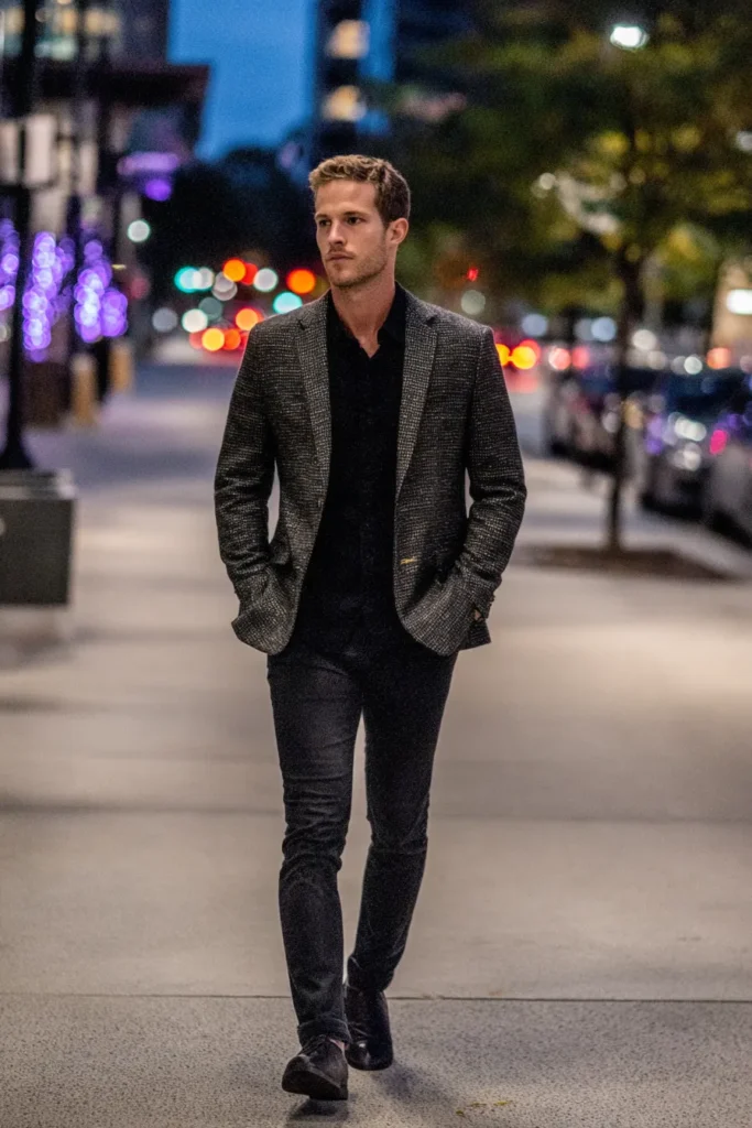 This look is the perfect combination of tailored polish and cool, urban casual, making it ideal for a more relaxed yet stylish party setting. The star is definitely the textured tweed blazer in dark grey and black, which adds a fantastic dimension and warmth to the outfit. Underneath, he’s wearing a solid black button-down or polo shirt and pairs it with sleek dark grey or black slim-fit denim, instead of dress trousers. He finishes the look with dark dress boots, creating an elevated yet approachable nighttime aesthetic.