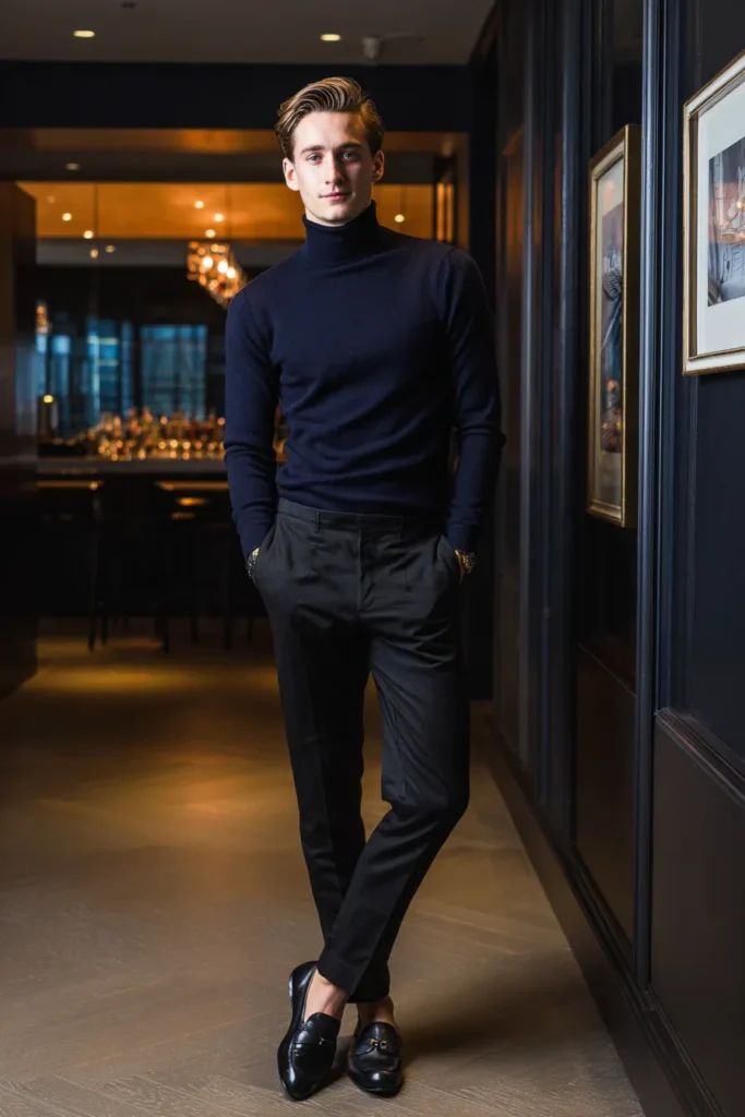 This is such a beautiful, timeless, and refined party look that would work for almost any classy event. The centerpiece is a fitted navy blue turtleneck sweater, likely fine merino wool or cashmere, which is incredibly elegant and chic. This is perfectly paired with tailored black or very dark charcoal trousers that have a sharp crease, giving the entire look a polished formality. He completes the ensemble with seriously sleek black leather loafers, cementing that luxurious, effortlessly cool vibe perfect for a cocktail bar or sophisticated dinner party.