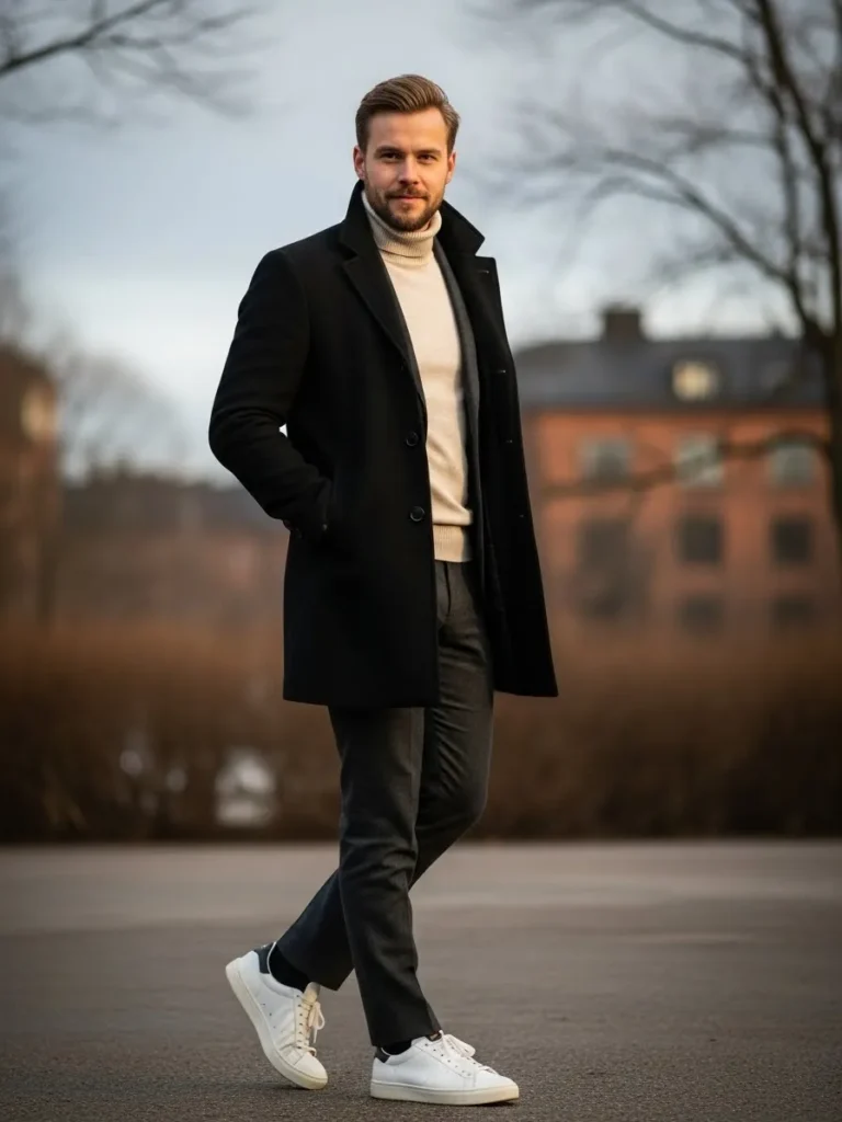 This look pairs a sharp black wool coat with a light knit sweater and slim dark trousers, finished with clean white sneakers that keep it modern and fresh.