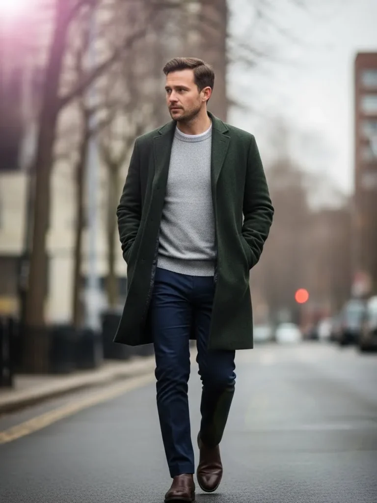 Here we see an olive green coat worn over a light knit sweater and dark slim trousers, paired with classic leather shoes.
