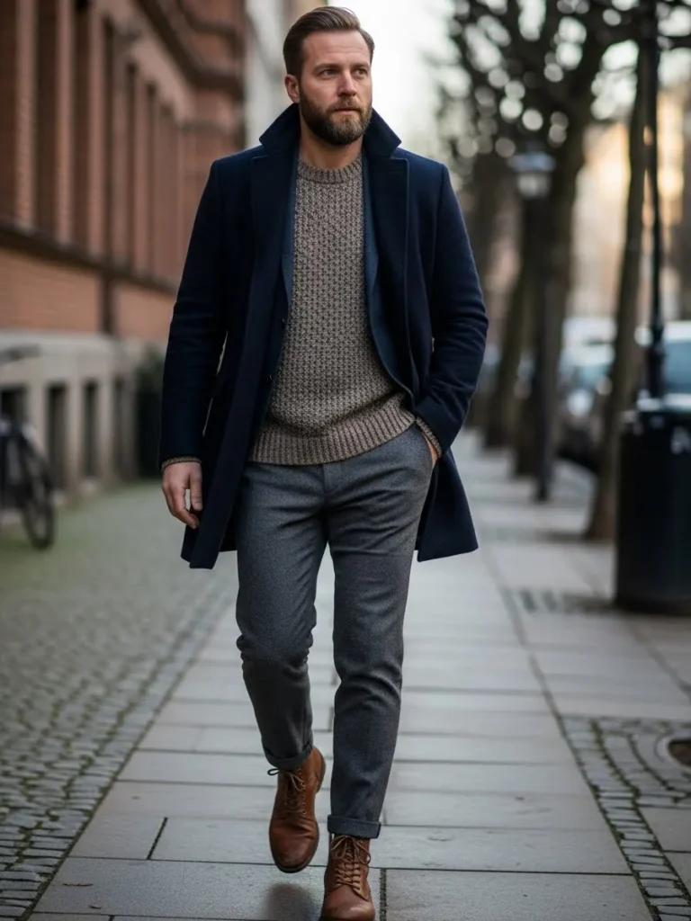 A deep navy coat is layered over a chunky knit sweater and gray tailored trousers, finished with brown leather boots.