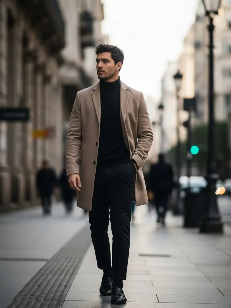 This look combines a camel coat with a black turtleneck and slim dark trousers for a sleek winter silhouette.