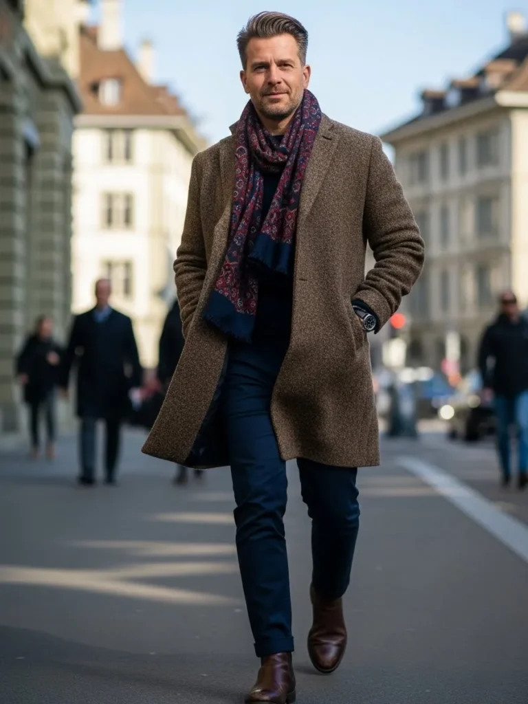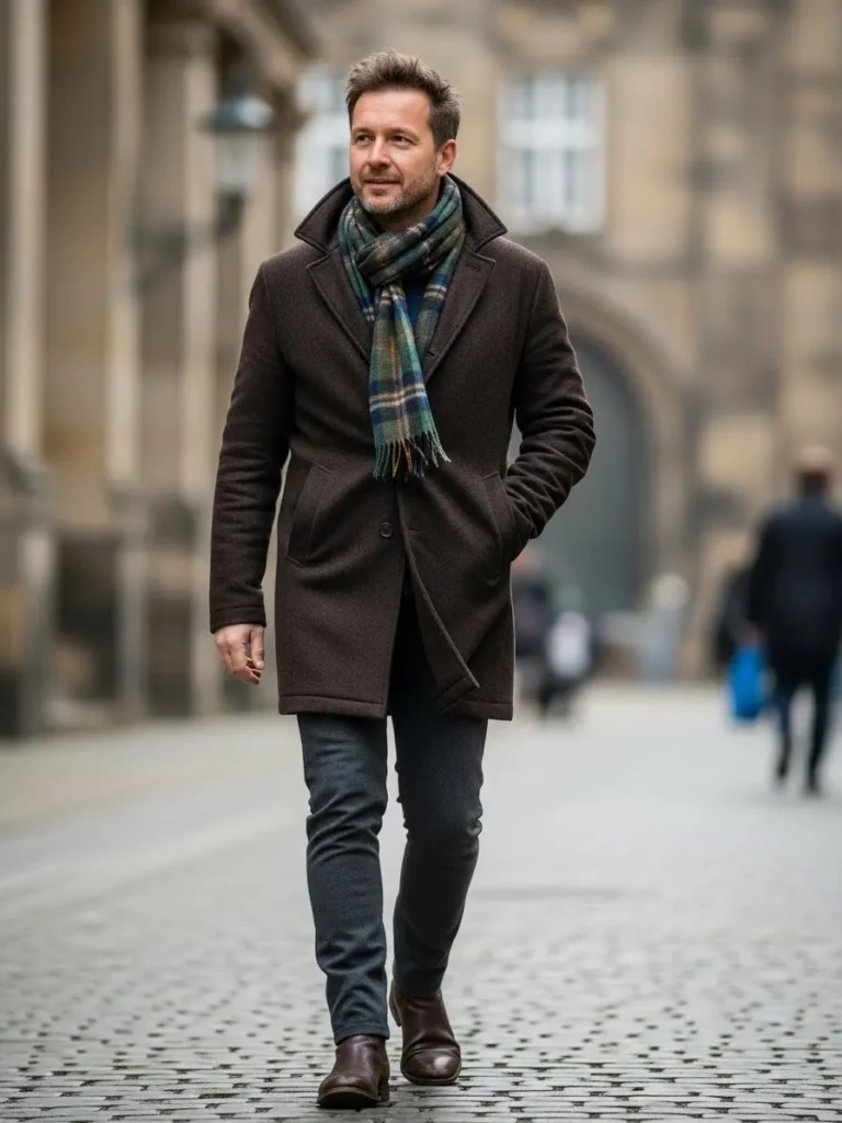 A rich brown coat paired with a patterned scarf, knit sweater, and dark jeans creates a warm and inviting winter look.
