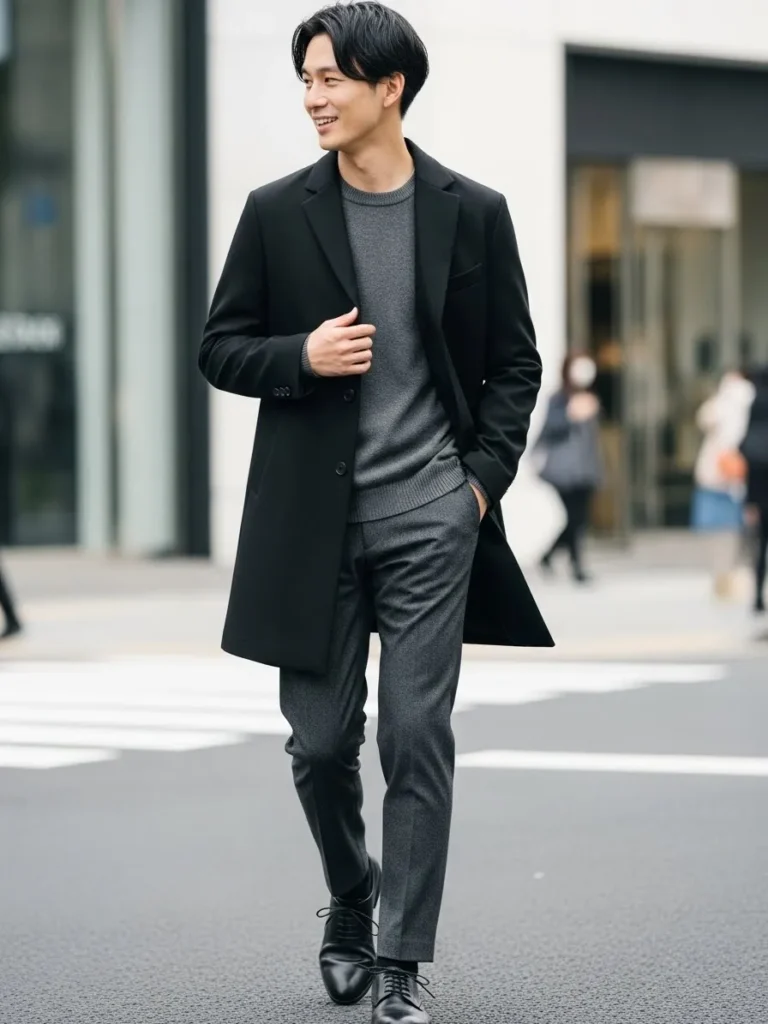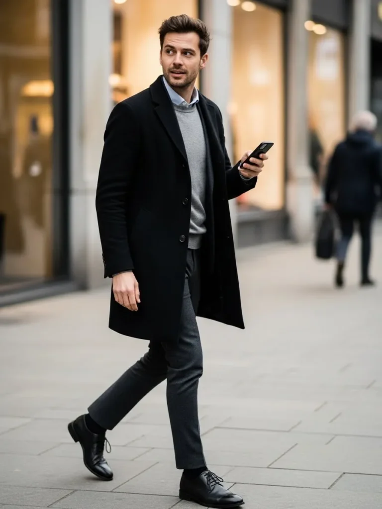 This outfit features a sleek black coat layered over a soft gray top and tailored dark trousers, finished with polished black shoes.