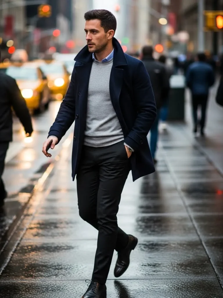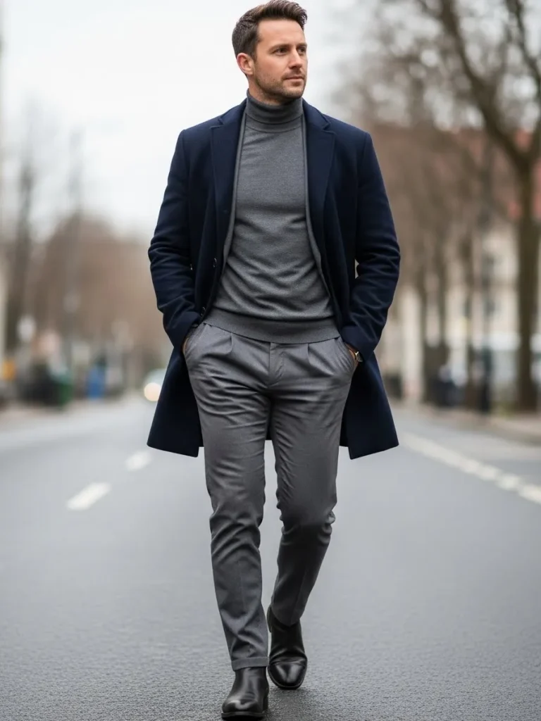 This outfit combines a deep navy coat with a soft gray knit sweater and tailored gray trousers, finished with dark leather shoes.
