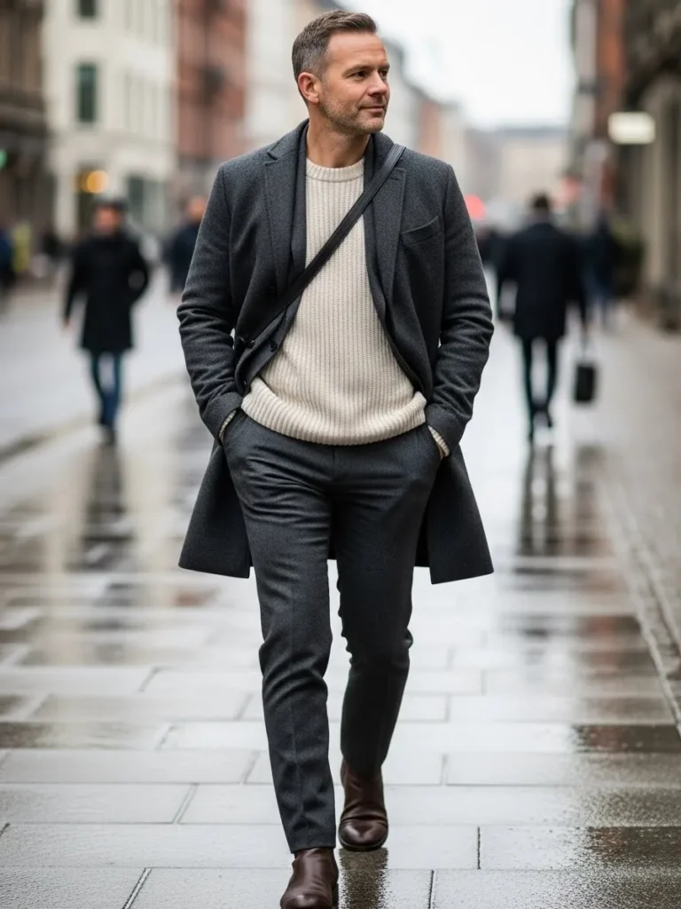 A tailored coat worn over a light knit sweater and dark trousers creates a sharp city look, styled with a crossbody strap for a modern touch.