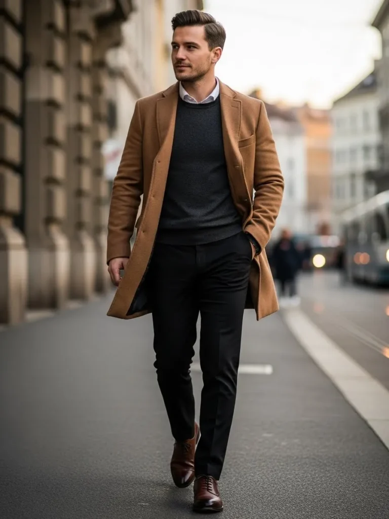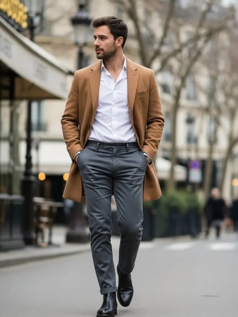 A warm camel coat instantly elevates this semi formal look, worn over a crisp white shirt and gray tailored trousers.