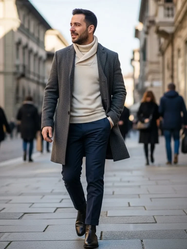 A structured gray overcoat layered over a soft beige turtleneck creates a refined and cozy winter look.