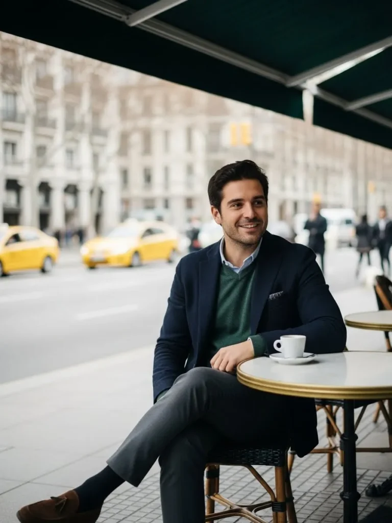 A tailored dark blazer layered over a knit sweater creates a cozy yet polished cafe look.