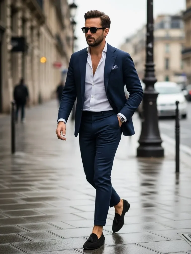 This look features a deep navy tailored suit paired with a crisp white shirt worn slightly open at the collar, finished with sleek loafers that keep everything dinner ready but not overdressed.