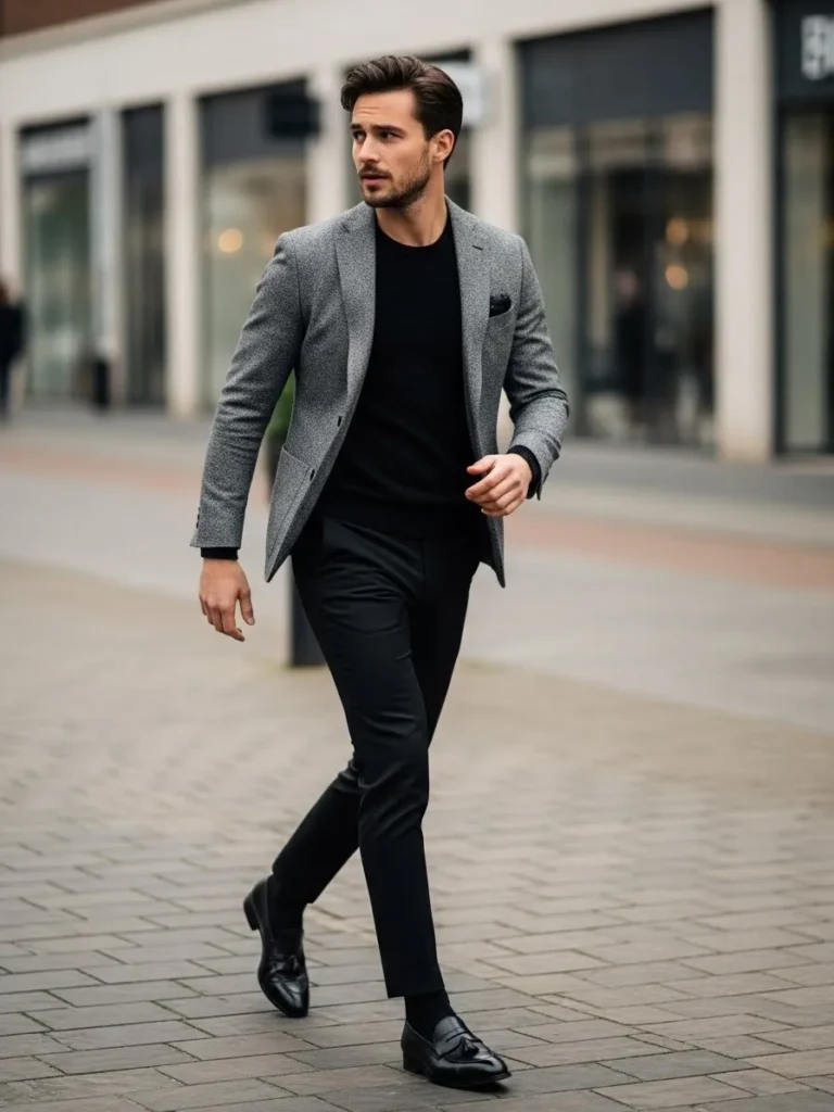 Here we have a gray blazer layered over a black top and slim black trousers, creating a sharp and contemporary dinner look.