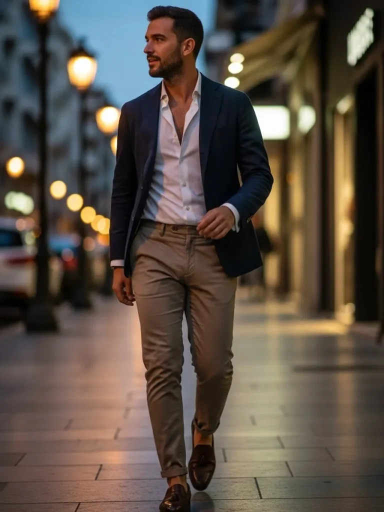 This outfit blends a dark blazer with a light shirt and tan chinos, finished with polished shoes for a refined dinner look.