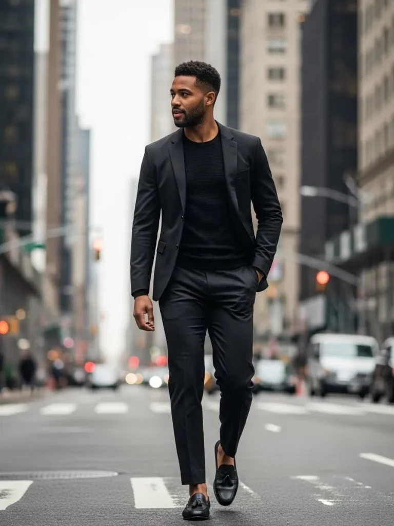 This look leans into an all black palette with a tailored blazer, dark shirt, and matching trousers, styled cleanly for evening wear.