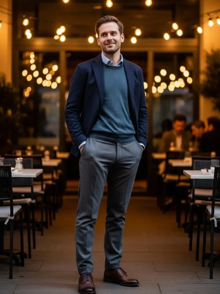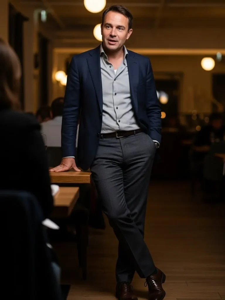 This outfit features a navy blazer styled with a light shirt and dark trousers, perfect for an upscale indoor dinner setting.