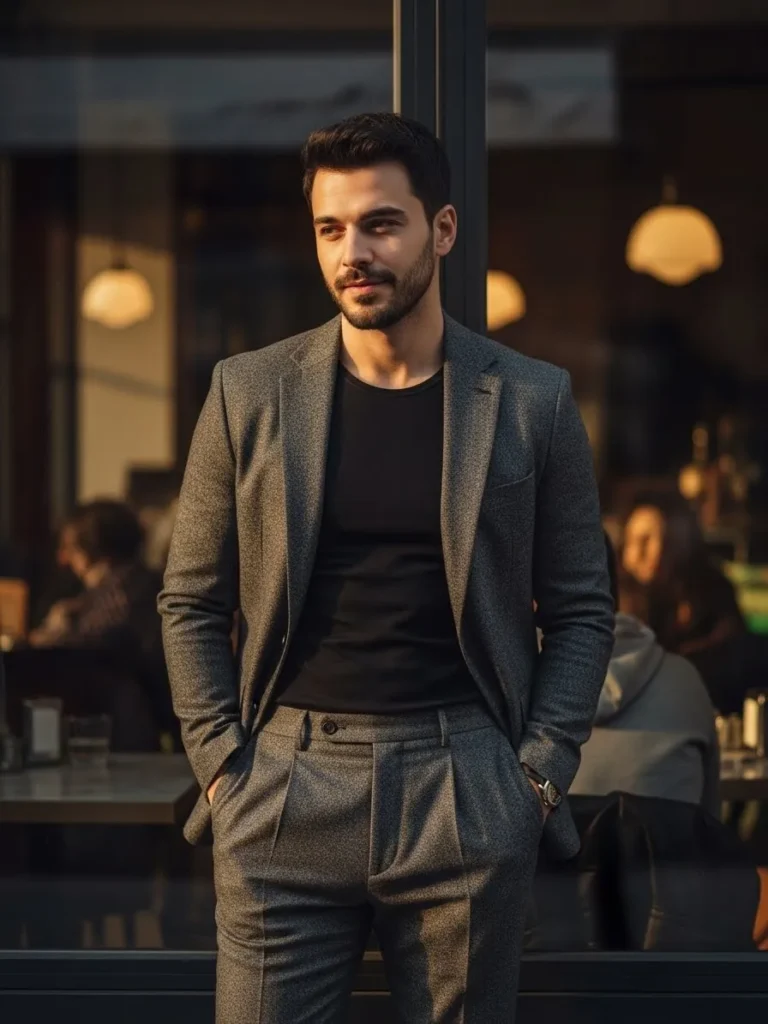 This outfit pairs a charcoal suit with a simple dark top and relaxed tailoring that feels modern and unfussy.