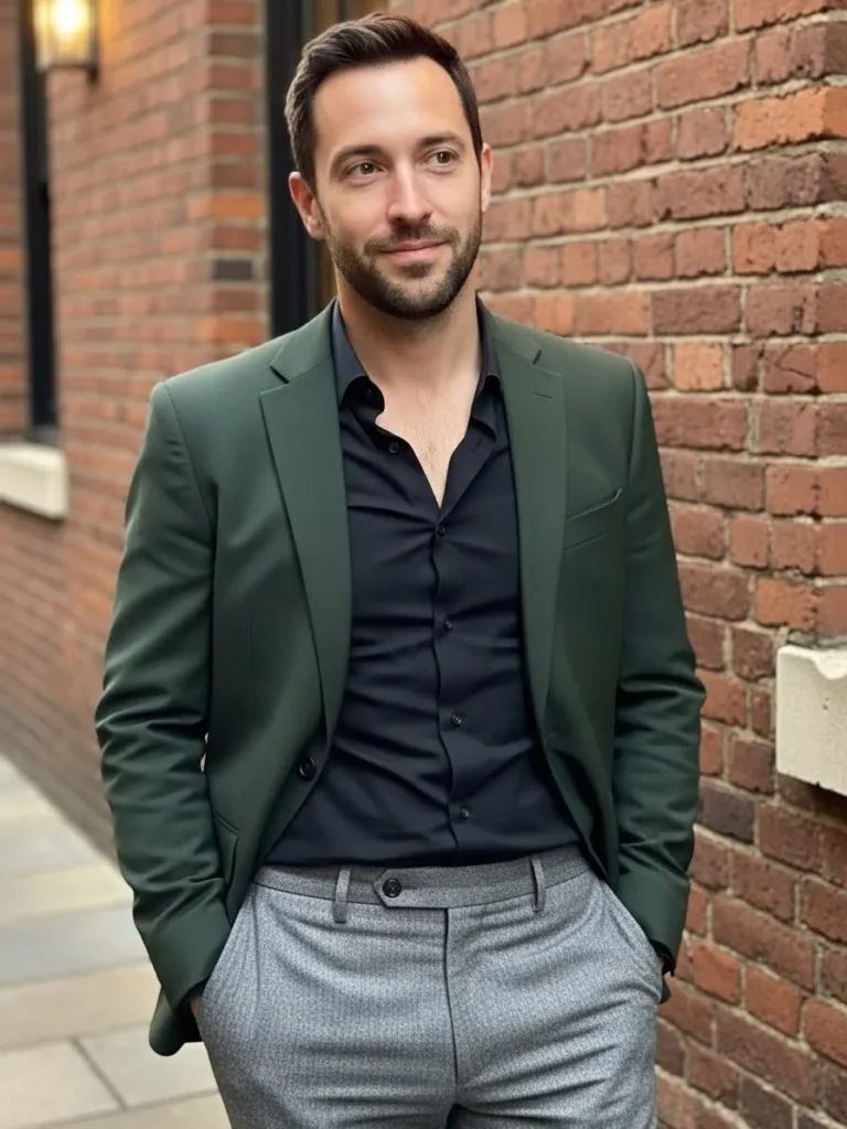 This outfit pairs a rich green blazer with a dark button up shirt and light gray tailored trousers for a striking but refined dinner look.
