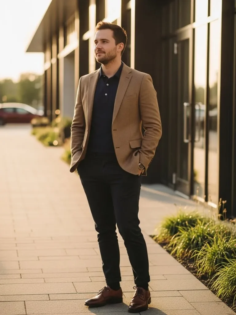 This look features a brown blazer paired with a light shirt and dark trousers, styled casually with hands in pockets and an easy smile.